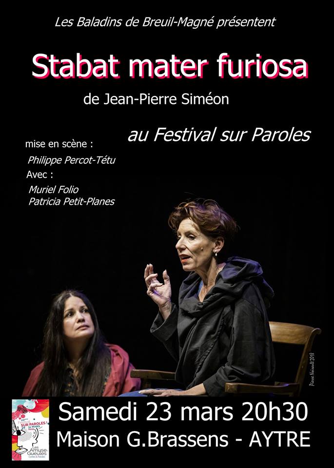 Le « Stabat mater furiosa » de JP Siméon est le cri solitaire d’une femme qui se révolte contre la guerre et la violence, cri, immense, incandescent, qui brûle les ombres de la conscience et frappe au cœur, cri d’une femme révoltée, furieuse. Elle dit l’horreur écarlate des corps broyés dans la machine guerrière, par-delà les larmes et la raison. « Je suis celle qui essaie de comprendre par la colère, comme la cascade comprend la roche par la colère » lance-t-elle, dressée comme un poing serré à la face de l’Histoire