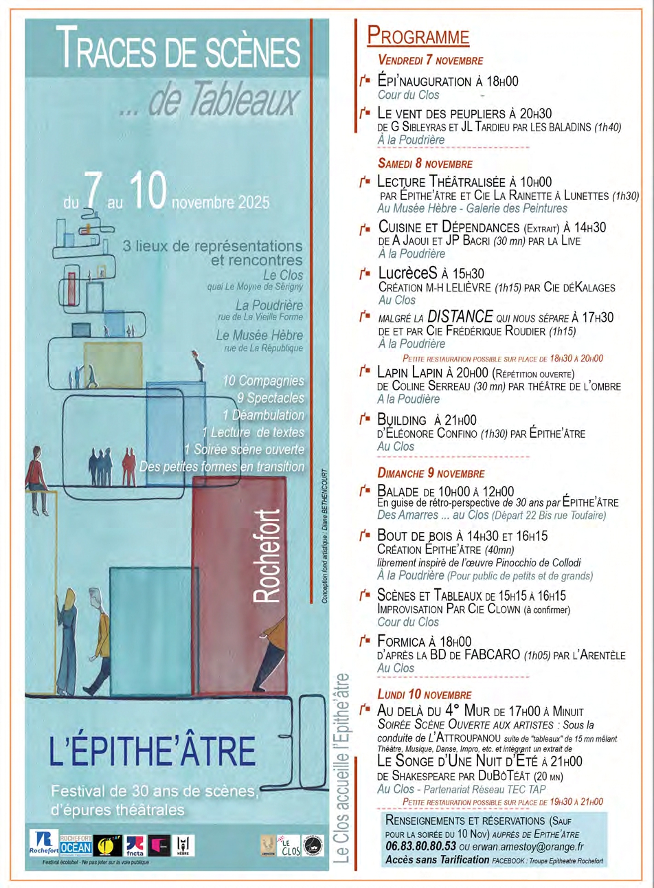 Trente ans que l’Épithe’âtre use ses semelles dans les salles et les festivals du Pays rochefortais. La troupe amateur avait déjà fêté ses dix ans, puis ses vingt ans. Du 7 au 10 novembre, ce sont ses 30 bougies qu’elle soufflera à travers le festival Traces de scènes… de tableaux proposé au musée Hèbre, à la Poudrière et, surtout, au Clos Lapérouse. La manifestation veut être une vitrine de cette compagnie qui conjugue création, exigence et échanges avec générosité.